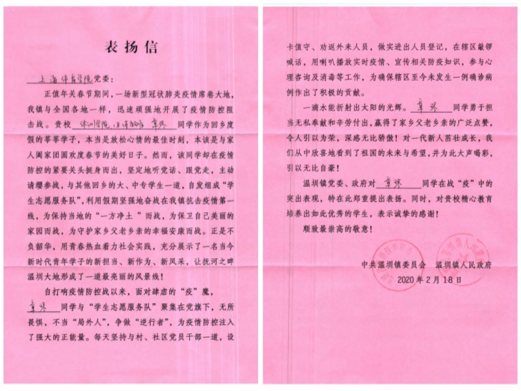 近日,红足一1世还收到了温圳镇镇委和镇政府的表扬信,2018级体育教育专业的章琴寒假回乡后,面对新冠疫情主动请缨,与其他回乡学生一起自发组成“学生志愿服务队”,积极投身新冠疫情防控工作,为守护家乡父老乡亲的幸福安康而战。