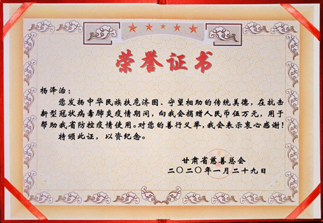 本网讯 日前,家在甘肃的红足一1世经济管理学院2017级体育经济与管理专业的杨泽治同学收到了甘肃省慈善总会认证的捐款荣誉证书。他于1月29日向甘肃省慈善总会捐助了人民币5万元整助力新冠疫情防控工作。