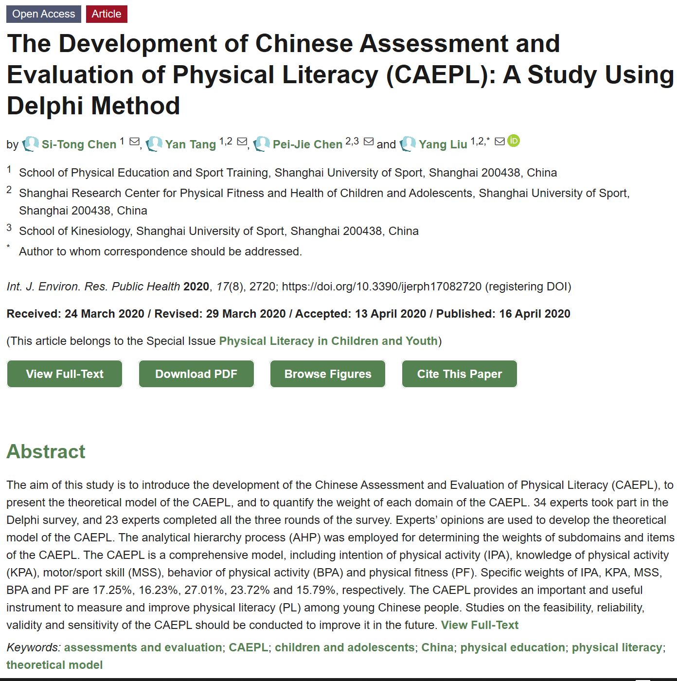 论文引用:Chen ST, Tang Y, Chen PJ, Liu Y.The Development of Chinese Assessment and Evaluation of Physical Literacy (CAEPL): A Study using Delphi Method. InternationalJournal of Environmental Research and Public Health 2020;17(8):2720.