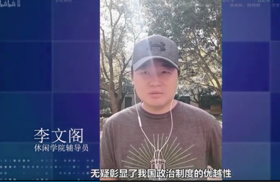 在海外访学的休闲学院辅导员李文阁老师通过VCR的形式向我们简述了自己对于中美战疫采取不同行动的看法,并和大家交流了他眼中的制度自信的含义和价值。