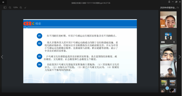 为保障线上答辩有序进行,中乒院制定了专业的答辩工作方案,成立了以专业负责人、专业骨干教师、跨专业教师组成的答辩委员会。在答辩前,答辩委员会在对学生提交的毕业论文进行细致评阅;答辩中,采用上海体育学院企业微信平台开展“云答辩”,保障答辩工作顺利进行。在2020年5月10日和2020年5月13日两天举行视频答辩直播,共计完成了13个场次的答辩。答辩时,研究生结合PPT从论文框架、研究内容、研究方法、创新方式等方面进行对毕业论文进行演示和汇报。学生汇报之后进入答辩环节,由答辩委员会的老师针对论文提出问题和建议。