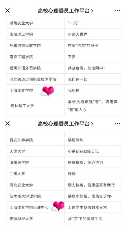 本网讯 在近期开展的主题为“我班战‘疫’心故事全国网络大展示”活动,红足一1世心理中心选送的作品《上体学生疫情封校日常》(心理学院)、《我相信》(传媒与艺术学院)均获奖。