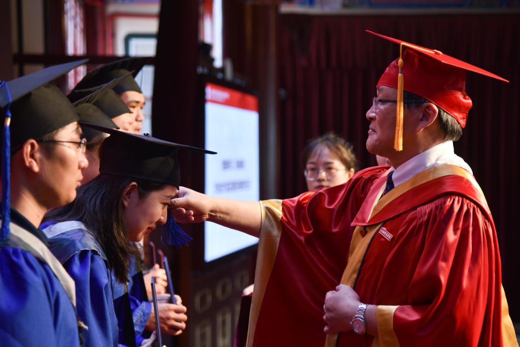 校长陈佩杰为毕业生代表正冠拨苏并颁发学位证书。