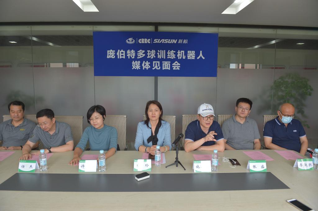本网讯 7月17日下午,备受社会关注的乒乓球机器人——庞伯特多球训练机器人媒体见面会在中国乒乓球学院举行。上海体育学院党委副书记、中国乒乓球学院党委书记杨玲,上海体育学院副院长、中国乒乓球学院院长施之皓,中科新松有限公司副总裁、上海庞勃特科技有限公司执行总裁许楠,上海体育学院宣传部部长张盛,中国乒乓球学院党委副书记、副院长李汶凯,中国乒乓球学院副院长陈彬,中国乒乓球学院副院长任杰出席见面会。包括新华社、五星体育、文汇报、解放日报等在内的十余家来自全国和上海的媒体参加了见面会。