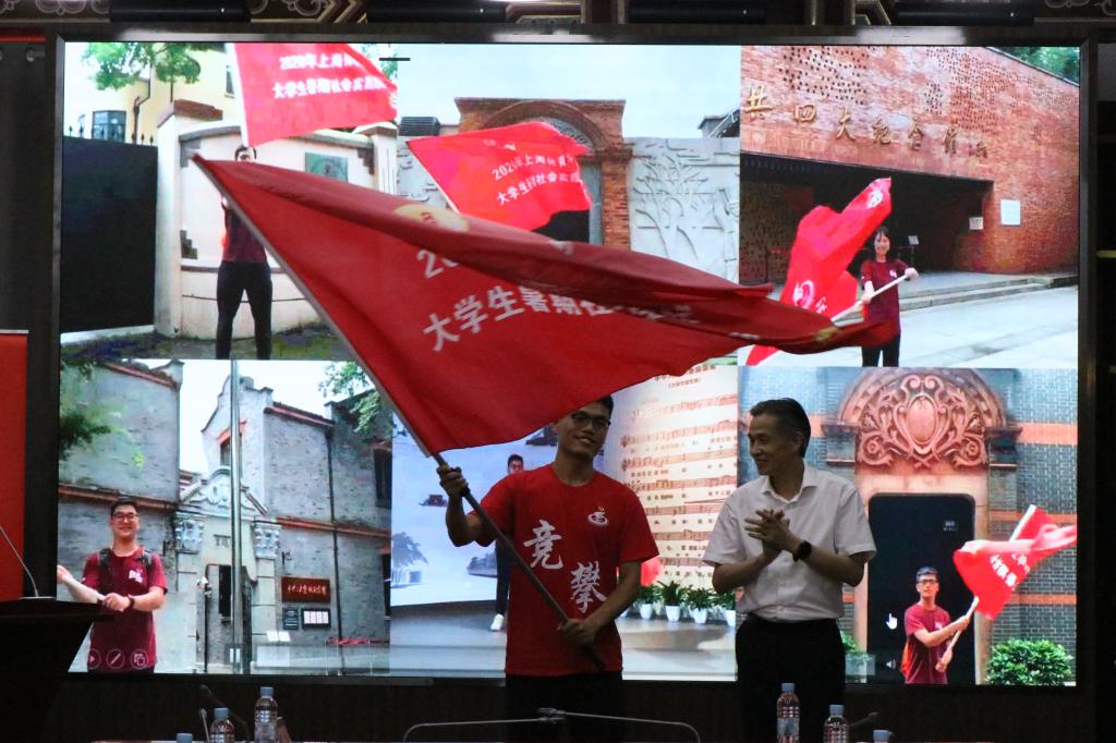在聘任仪式后,举行了2020年大学生暑期社会实践出征授旗仪式,党委副书记、副院长陈晓峰授社会实践出征总旗,由校学生会执行主席刘统接旗。在活动的最后,现场的师生代表与线上观看直播的绿瓦学子,共同观看了《走近中共一大:聆听中国共产党的初心与使命》“红色竞攀”微课,在讲解员老师的带领下,走进中国共产党第一次代表大会的会址,重温党的光荣历史,聆听共产党人的初心和使命,坚定理想信念,弘扬竞攀精神。