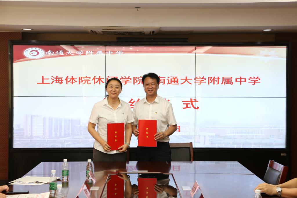 随后,休闲学院院长王红英与南通大学附属中学副校长周云旗签订了合作协议。