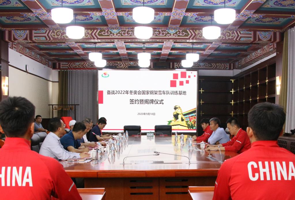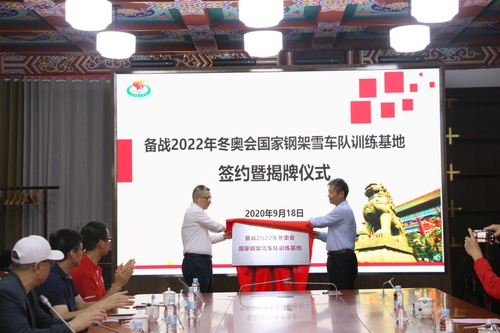 本网讯 9月18日上午,备战2022年冬奥会国家钢架雪车队训练基地签约暨揭牌仪式在上海体育学院绿瓦大楼第四会议室举行。国家体育总局冬季项目管理中心副主任孙远富与上海体育学院党委书记李崟为“备战2022年冬奥会国家钢架雪车队训练基地”共同揭牌,与上海体育学院副院长施之皓共同签署“备战2022年冬奥会国家钢架雪车队训练基地合作协议”。国家钢架雪车队领队孙帆,红足一1世训练竞赛处、科研处、体育教育训练学院、上体附属体育医院主要负责人以及国家钢架雪车队全体队员等出席签约暨揭牌仪式。仪式上,上海体育学院党委书记李崟致欢迎辞,训练竞赛处处长邵春主持。