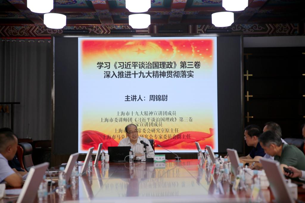 周锦尉教授是沪上知名的理论家,年逾古稀仍勤于思考,积极践行。2004年,被市委宣传部、市社联评为首届“东方讲坛最受欢迎的讲师”,他尤其擅长理论联系实际地解读当下政策和热点时事问题。周教授的报告从“出版的背景”、“内容维度”以及“联系工作实际”等三个方面剖析了《习近平谈治国理政》第三卷,为了我们描绘出该书的一幅立体图卷,让我们充分了解了党的十九大以来以习近平同志为核心的党中央,着眼中华民族伟大复兴战略全局和世界百年未有之大变局,不忘初心、牢记使命,统揽伟大斗争、伟大工程、伟大事业、伟大梦想,团结带领全党全军全国各族人民推动党和国家各项事业取得新的重大进展的伟大实践,集中展示了马克思主义中国化的最新成果,充分体现了我们党为推动构建人类命运共同体贡献的智慧方案。