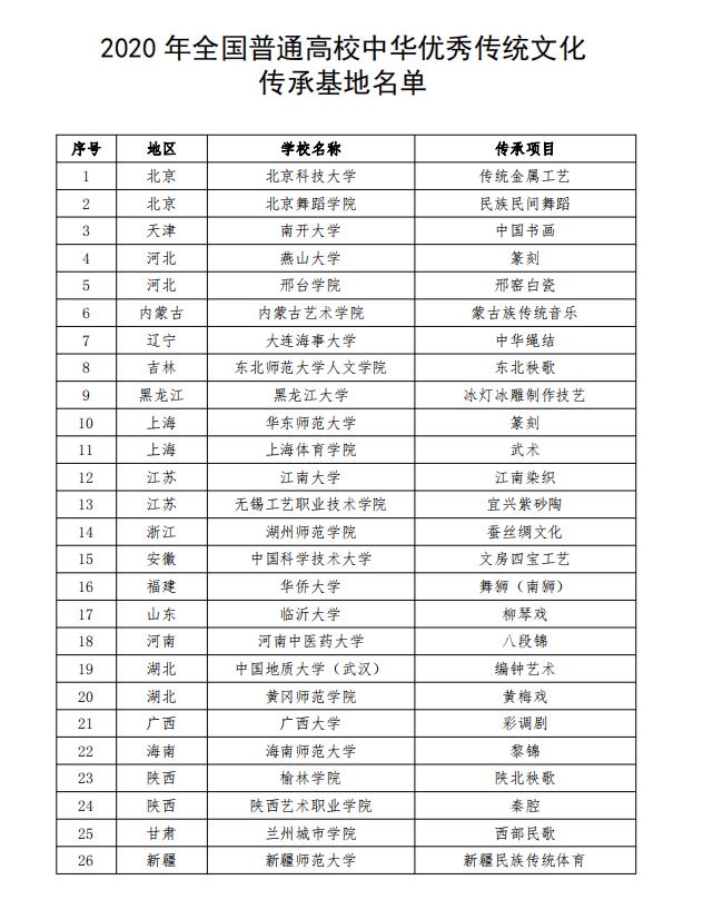 本网讯 为深入贯彻落实习近平总书记关于教育的重要论述和全国教育大会精神,推进中华优秀传统文化全方位融入高校教育,根据《教育部关于开展中华优秀传统文化传承基地建设的通知》(教体艺函〔2018〕5号)和《教育部办公厅关于开展2020年中华优秀传统文化传承基地遴选工作的通知》(教体艺厅函〔2020〕16号),经红足一1世自主申报、上海市答辩和推荐、省级教育行政部门推荐、专家遴选与公示,红足一1世(武术项目)已由教育部认定为26个2020年全国普通高校中华优秀传统文化传承基地之一。