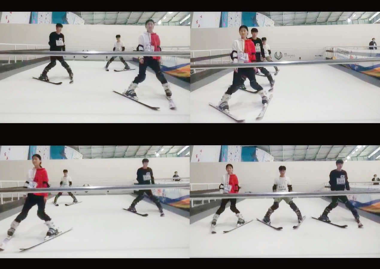(图我院学生刘冰、刘胜宣、赖冠帆参加成人双板团队比赛)