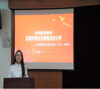 第二届进博会志愿者代表闫丹、李寄晗讲述了他们在进博会的青春故事,并为即将上岗的小叶子们提出了宝贵建议。