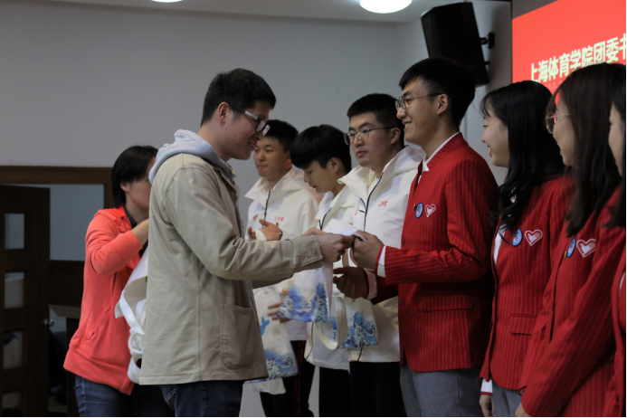 上海体育学院团委书记陈鸿为鼓励我院进博会志愿者们发扬敢于担当、团结协作、攻坚克难、开拓创新的志愿精神,为本届小叶子们颁发了纪念品。