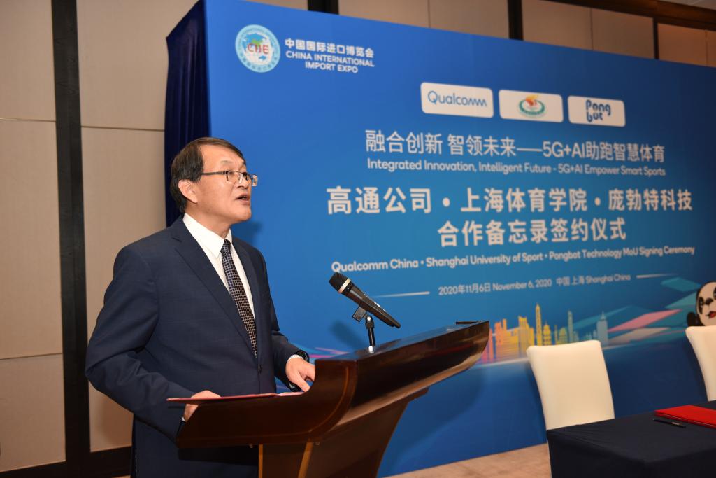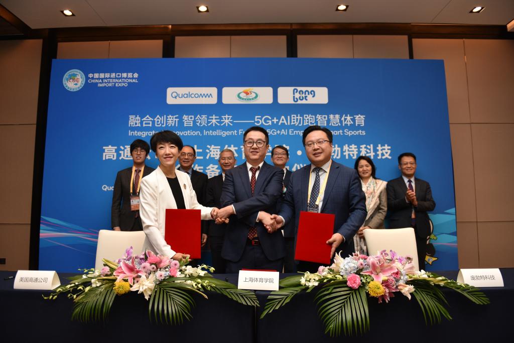 本网讯 2020年11月6日,上海体育学院与高通公司、上海庞勃特科技有限公司在第三届中国国际进口博览会上举行合作备忘录签约仪式。高通中国区董事长孟樸,上海体育学院党委副书记、院长陈佩杰,上海庞勃特科技有限公司董事长杨跞,上海体育学院党委副书记杨玲等领导出席活动。