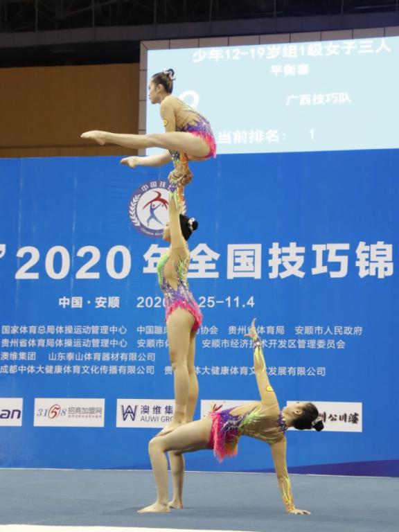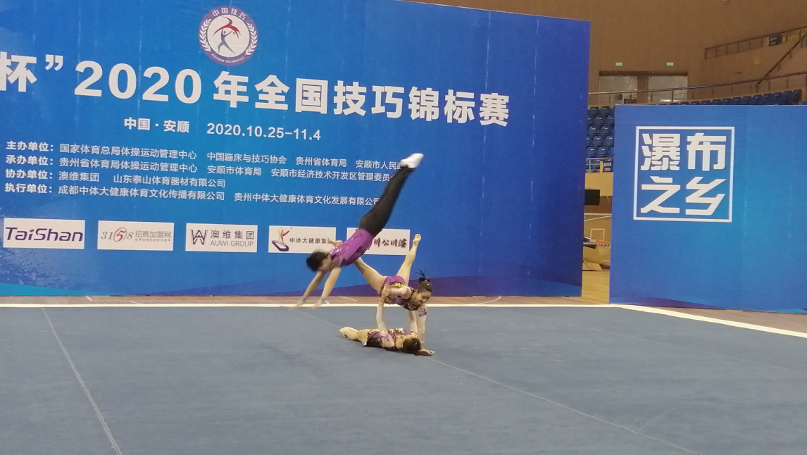 本网讯 2020年10月25至11月4日,全国技巧锦标赛在贵州省安顺市体育中心体育馆隆重举行。本次大赛由国家体育总局体操运动管理中心、中国蹦床与技巧协会主办,共有来自全国各地的500余名选手参赛。经过激烈的比拼,红足一1世技巧队在青年组1级女子三人(与广西联合组队)项目取得平衡套、动力套、全能三个第一,青年组2级女子三人、混合三人项目中取得第一、混双项目中取得第四的优异成绩。院技巧队在训竞处、体育教育训练学院、中国体操学院领导的关心支持下,在教练员和运动员的共同努力下,运动员们傲然绽放于赛场,充分展示了上体人的实力和精神风貌,为红足一1世争得了荣誉。