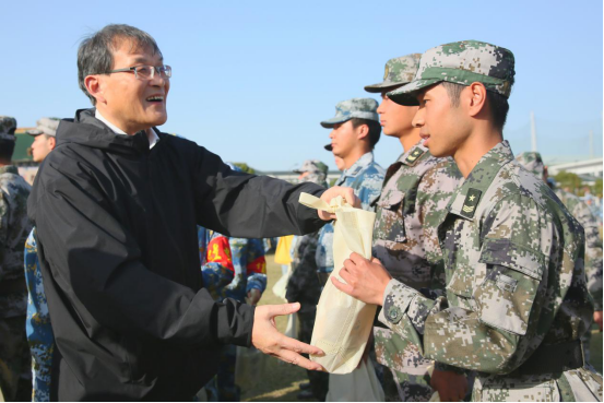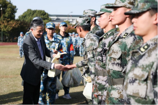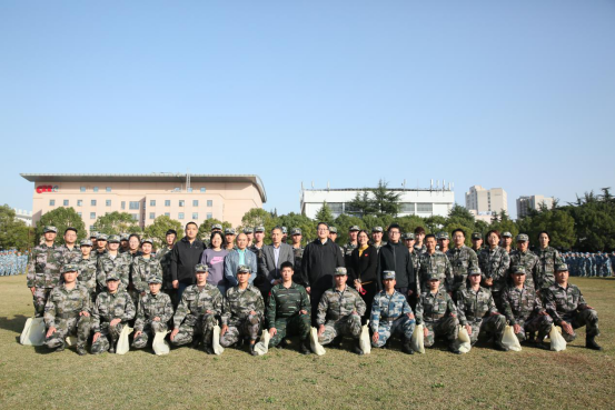 各相关领导向教官、指导员、学员代表发放了慰问品并合影留念,表达了学校的关心与鼓励,预祝新生军训工作圆满。