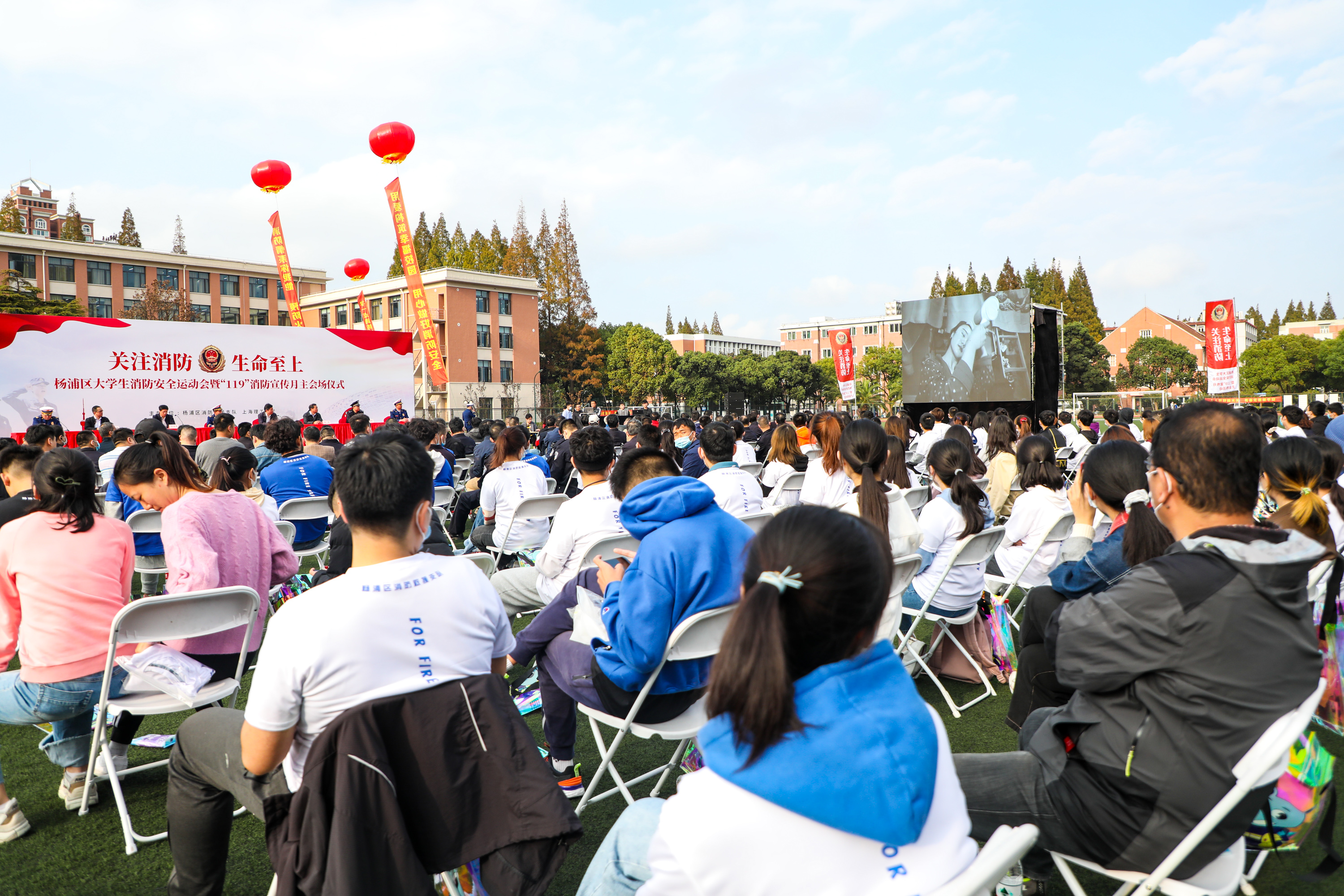 活动由一场剧场消防演习拉开帷幕,上体的同学们认真观看学习。