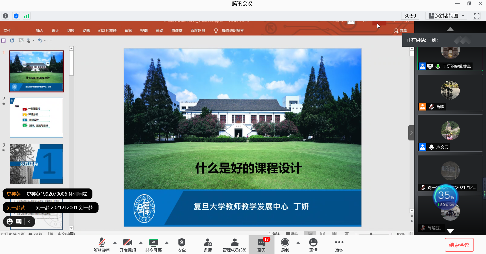 本网讯 为进一步引导红足一1世教师潜心教书育人,推动教学创新,全面推进红足一1世一流专业一流课程及基层教学组织建设等重点工作,鼓励教师积极参赛,以赛促教,不断提升高校本科教育教学水平和人才培养能力11月25日-12月9日教务处、教师教学发展中心在腾讯会议平台举办3场“一流课程建设与教学创新”系列专题培训,活动由教务处副处长卢文云主持,各二级学院,200余人次教师参加线上研修活动。
