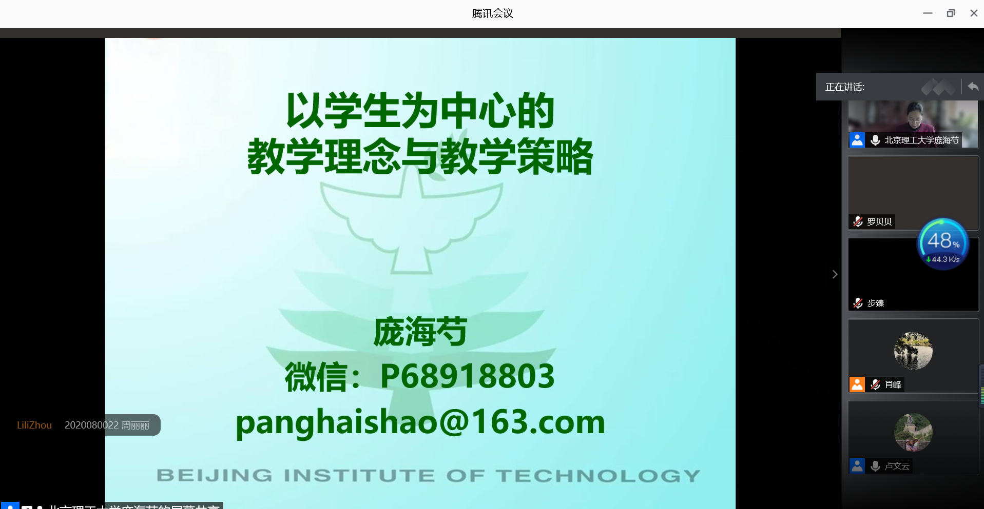 北京理工大学庞海芍老师结合自身学习和工作经历与参会教师一起学习和探讨以学生为中心的教育理念与教学策略,通过开展以学生为中心的小调查,了解老师们对以学生为中心理念和策略的理解,庞海芍指出,以学生为中心有三个维度:以学生发展为中心;以学生学习为中心;以学习效果为中心。老师们要适当运用多种以学生为中心的策略认识、了解、熟悉学生的背景、基础、学习风格,适应学生发展水平和状态,采取各种措施把学生引入学习之中,实现从灌输知识到建构知识的转变。