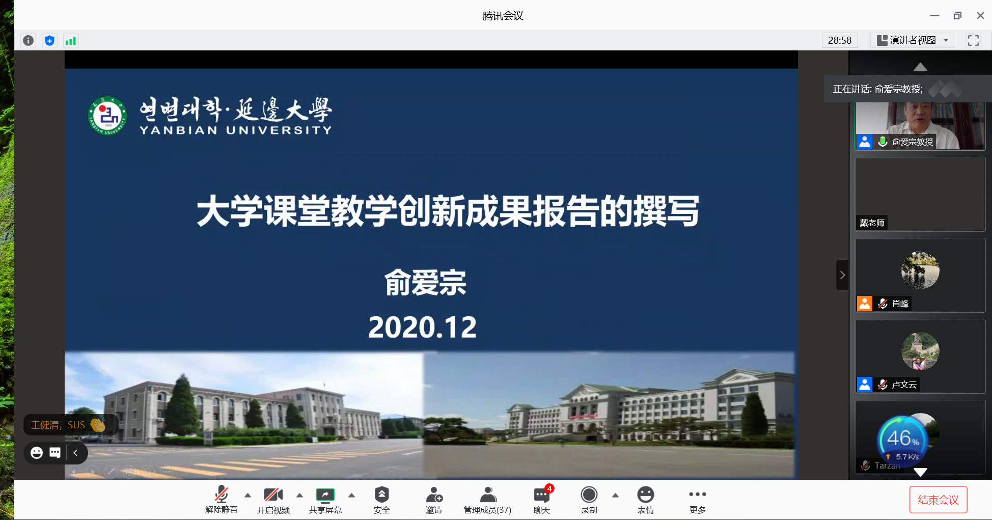 延边大学俞爱宗老师从教学创新的特征与逻辑、教学创新的过程、教学创新成果报告的结构与撰写三个维度讲解教学创新,俞老师认为教学创新是指基于问题,开展长期的探索,形成理性认识和实际改革方案,并经过实践检验,使教育对象实现显著高阶目标的教学成果,老师们需要在教学研究与改革中,找准问题,发现内在规律,进行顶层设计,并运用先进教育教学理念分析因果关系,对改革方案、研究对象进行效果分析判断,从而形成教学创新成果。在报告撰写部分,俞老师详细解读本次全国教学创新大赛要求,结合担任全国教学创新大赛评委的经历,全面讲授报告各个部分的撰写内容及写作中可能存在的问题,并为参赛教师设计出从“总结亮点”出发到“创新汇报”的备赛路径。