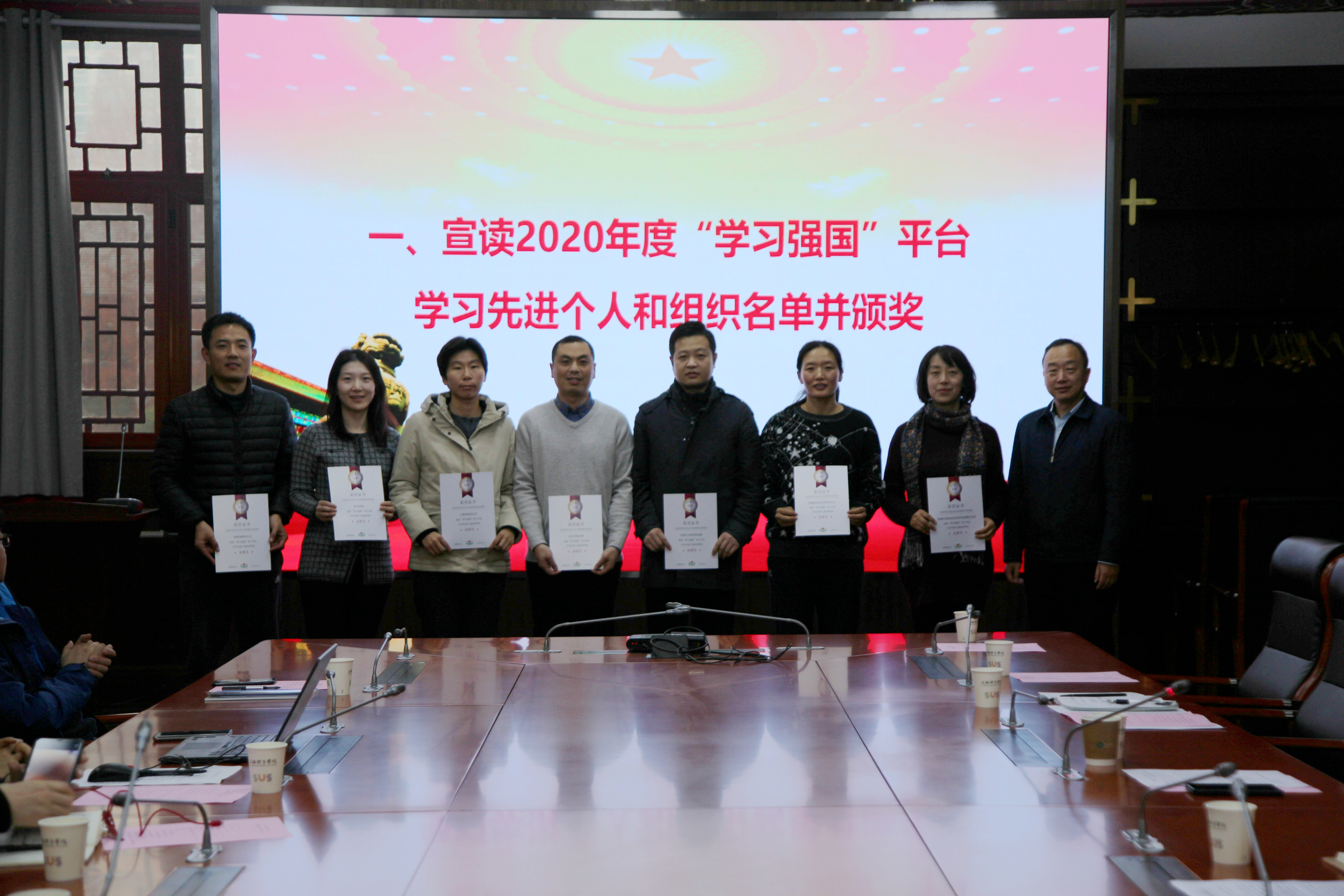 会议表彰了学校2020年度“学习强国”平台学习先进个人和组织名单。经各二级学习管理组报送,综合各单位全年学习积分排名,附属体职院直属党支部、附属竞校党总支、机关党委、后勤保障党总支等4家单位荣获2020年度“学习强国”“竞攀奖”,中乒院党委、武术学院党委、心理学院党总支等3家单位荣获2020年度“学习强国”“拼搏奖”奖,张思帆等14名个人荣获“学习达人”称号。