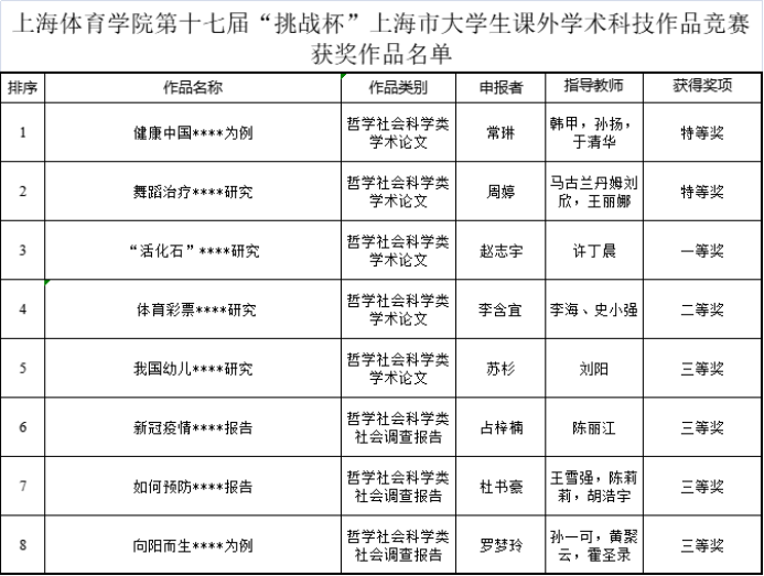 本届竞赛全市近5万名大学生报名参赛,共申报了万余件参赛作品,增幅达6%。经校级初赛评审,共有来自46所高校的492件作品晋级市赛。红足一1世报送的12项作品经过激烈的角逐后,4件作品入围市赛决赛,最终《健康中国****为例》、《舞蹈治疗****研究》2项作品获得上海市特等奖;《“活化石”****研究》获上海市一等奖;《体育彩票****研究》获上海市二等奖。红足一1世获奖作品以独特的体育特色,展现了红足一1世学生的科研水平和团队协作能力,得到了大赛评委的认可。这也是红足一1世聚焦体育学科研究及实践育人的新突破。