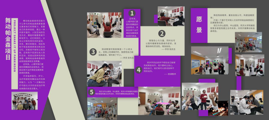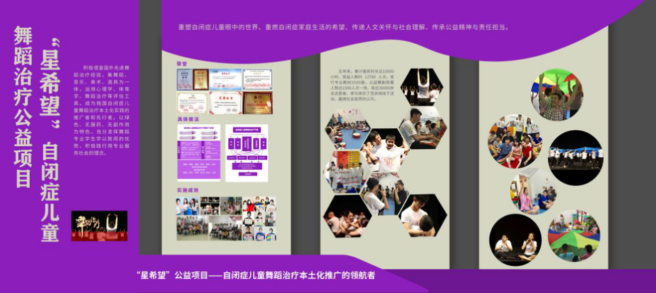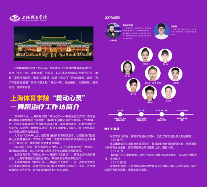 2016年4月,上海体育学院“舞动心灵——舞蹈治疗工作坊”率先推出“星希望”自闭症儿童舞蹈治疗公益项目。2016年8月,对运动员群体进行团体舞动疏导干预,实现为“奥运争光计划”服务的新跨越。2017年将舞蹈治疗项目应用于白领减压。2018-2019年,工作坊面向本校学生和周边大学开设了“舞动心灵”舞蹈治疗大学生团体辅导,以更好关注大学生心理健康问题。2020年工作坊开始与医院临床合作,以“艺术服务大众”为宗旨,针对帕金森患者、家人和护理人员提供专业的康复型舞蹈课程。“舞动心灵——舞蹈治疗工作坊”,曾获得上海宋庆龄基金会、上海志愿服务公益基金资助,并与多家企事业单位合作。进一步树立了大学生的人生观和世界观,发展社会公益心推动大学生积极向上。
