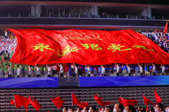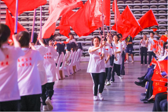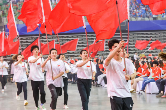 旗手节目组从接到表演邀请到现场表演,只有一周时间准备,来自于运动科学学院、武术学院、经济管理学院及校学生会等单位的近300名旗手分成“红旗表演团”和“各单位(学校)旗帜表演团”,将表演贯穿整场晚会,从开篇的《红旗颂》的有序出场、到尾声的《不忘初心》整体挥动,以及伴随主要节目来营造互动氛围的挥舞,还有观众参与感较强的绕场巨型红旗“永远跟党走”,都来自于红足一1世参演代表热情洋溢的表演。他们虽然不在灯光耀眼的舞台上,但全程活跃于整个东方体育中心场馆内,没有互动环节时就耐心地“隐藏”在观众过道,一有表演就立马扛着红旗鱼贯而入、尽力挥舞,旗杆和旗帜就是青年的责任寄托,笑容和热情就是青年的青春写照。旗手节目组的表演可能没有独占几分钟的台上亮相,但为整场近100分钟的节目营造热络而昂扬的现场气氛。