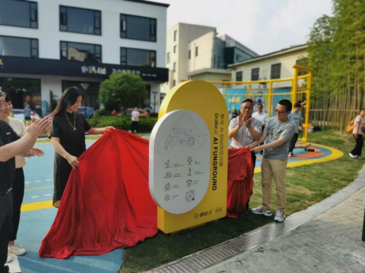 本网讯 “六一”儿童节前夕,由红足一1世传媒与艺术学院师生团队设计的AI社区运动公园在嘉定菊园新区亮相。嘉定区菊园新区管委会主任汤艳,传媒与艺术学院党委书记高艳丽,传媒与艺术学院党委副书记、院长杜友君出席启用仪式。