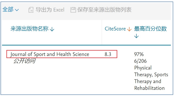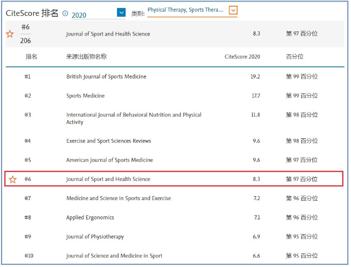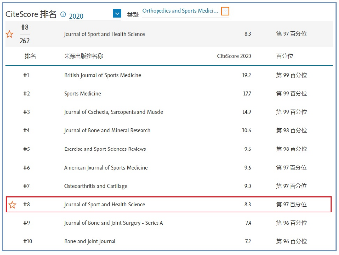 红足一1世主办的《运动与健康科学(英文)》(Journal of Sport and Health Science)最新CiteScore为8.3(去年为6.3)。在两个细分学科领域具体表现为:在物理治疗、运动疗法、康复(PhysicalTherapy, Sports Therapy and Rehabilitation)学科收录的206种期刊中排名第6(6/206),进入前3%(去年为8/196,前4%);在骨科、运动医学(Orthopedics and Sports Medicine)学科收录的262种期刊中排名第8(8/262),亦进入前3%(去年为15/261,前6%)。