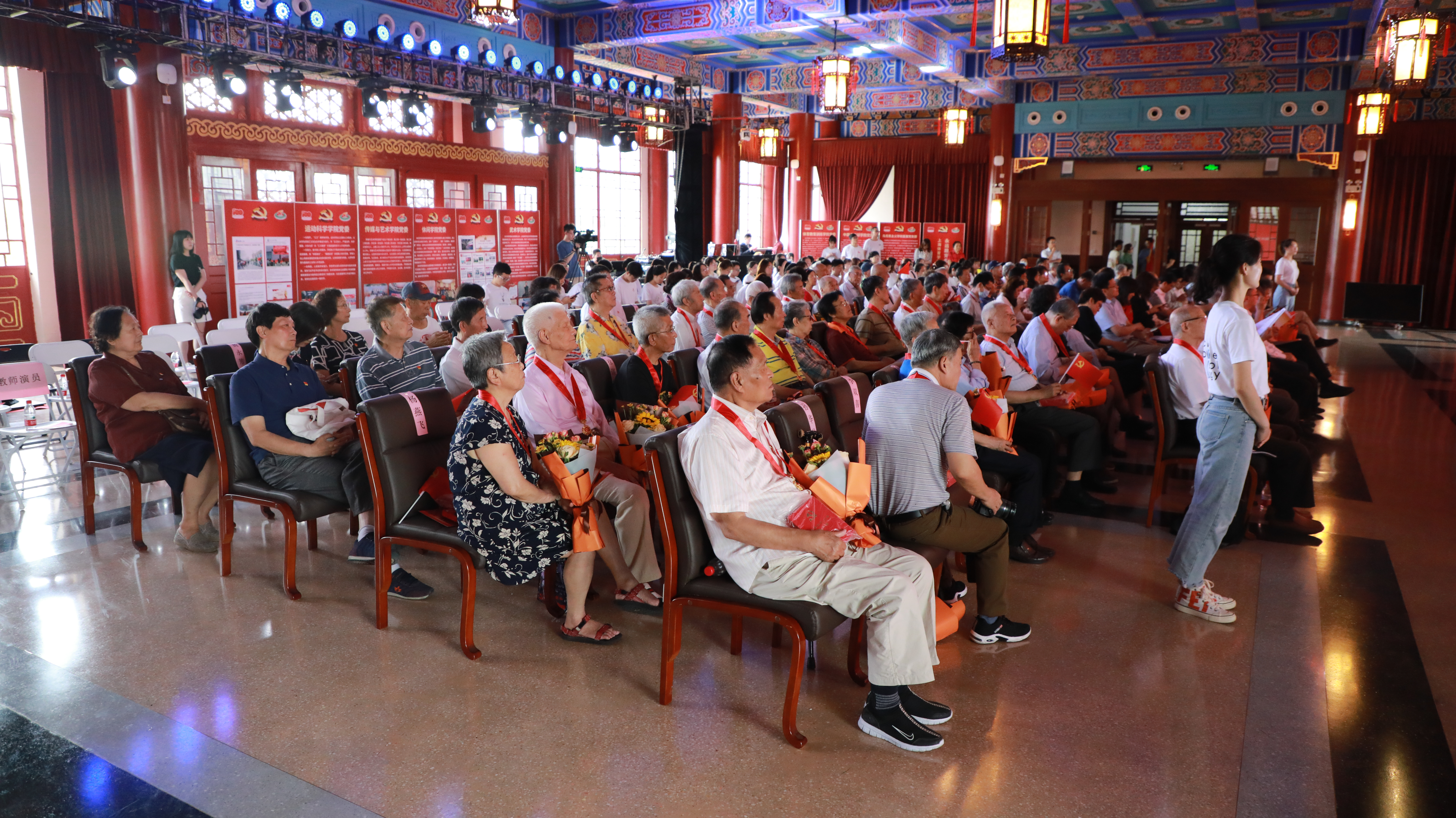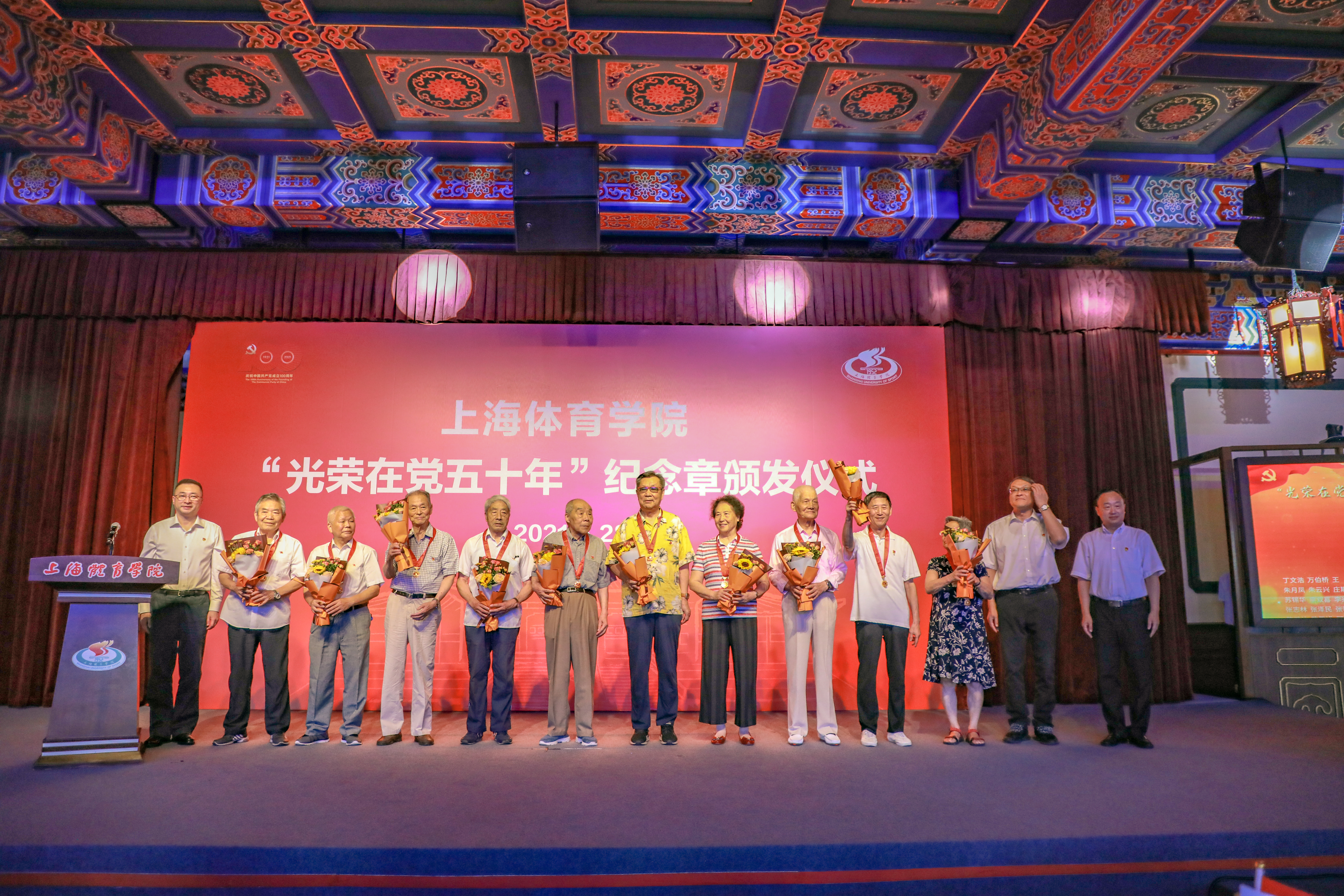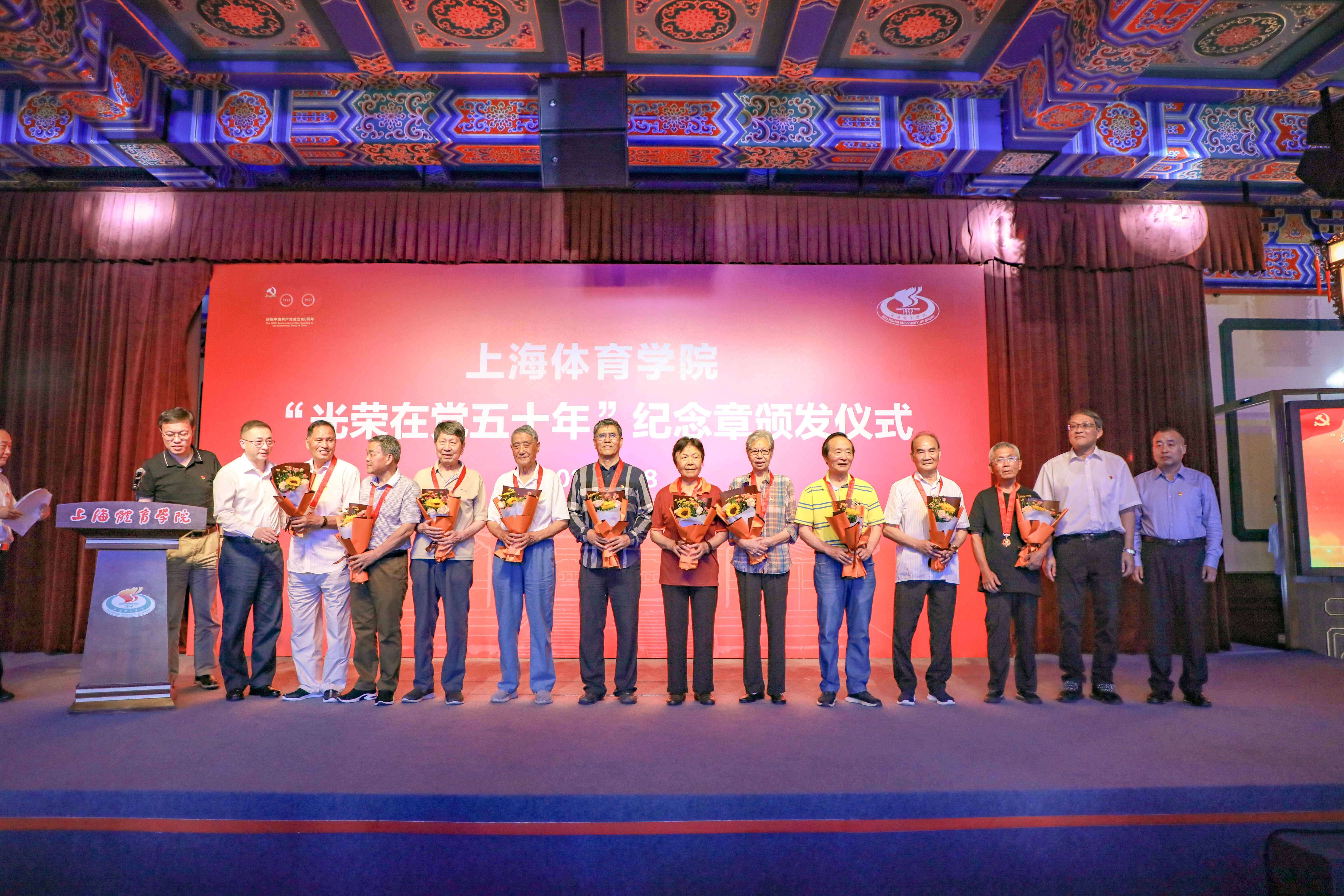 颁发仪式上,李崟、陈佩杰为“光荣在党五十年”纪念章获得者代表颁发纪念章,潘勤、杨玲、崔勇、王继红、王陈等校领导为老党员献花祝贺。全体与会人员用热烈的掌声向获得“光荣在党五十年”纪念章的老党员致敬。