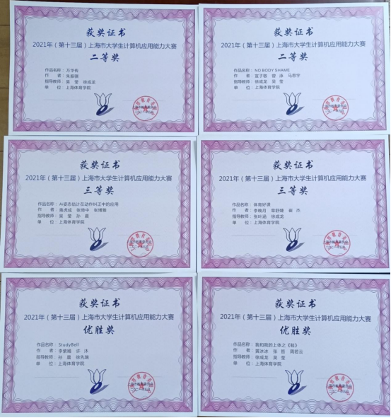 经济管理学院吴莹、张叶涵、徐成龙、孙晨、徐先瑞五位教师指导学生参加了多媒体制作、程序设计应用、人工智能应用、程序设计应用4类比赛的角逐,其中,朱振骐原创音乐作品《万华传》,马思宇、宣子敬、曾添团队原创视频作品《NO BODY SHAME》获二等奖;李晚月、章舒婕、崔杰团队的原创微信小程序作品《体育好课》,蒋虎成、张倚中、张博雅团队的原创人工智能应用作品《AI姿态估计在动作纠正中的应用》获三等奖;李紫嫣、许沐团队的原创程序设计作品《StudyBell》,黄冰冰、张哲、周若云团队的原创视频作品《我和我的上体之“鞋”》获优胜奖。