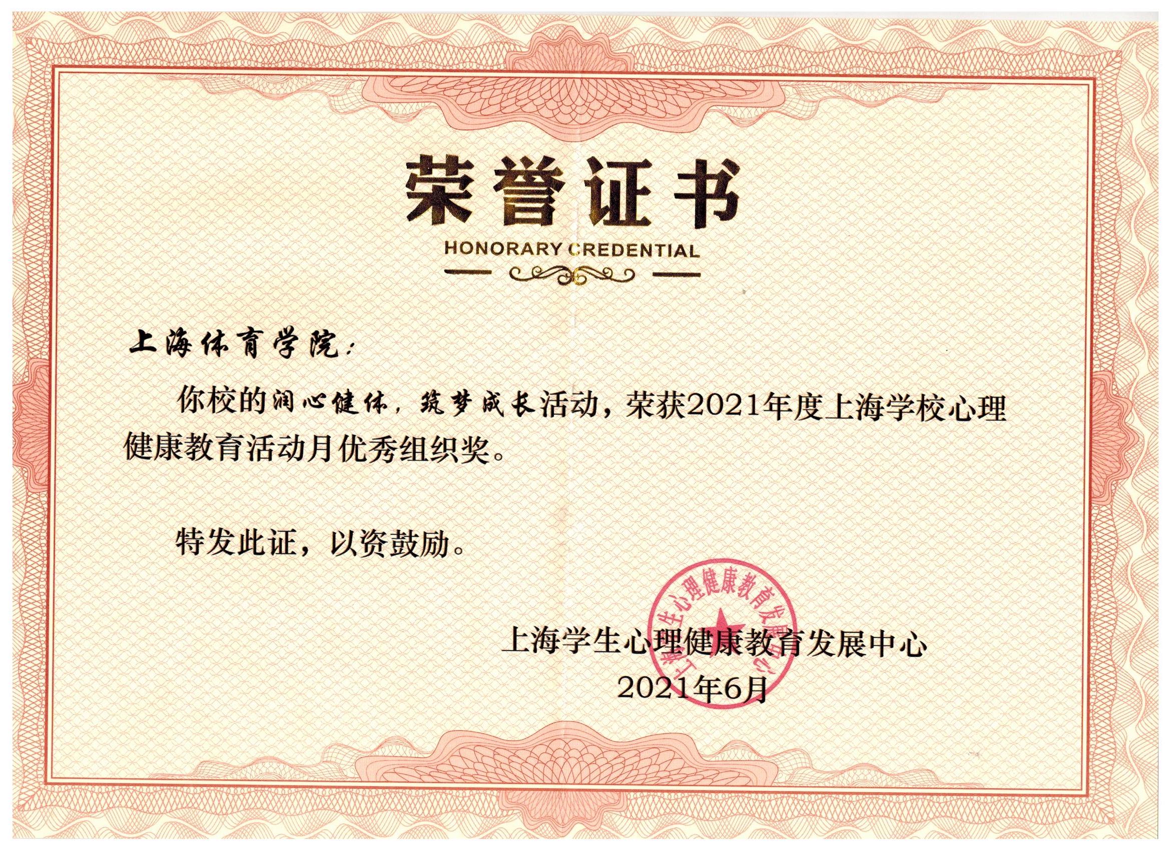 本网讯 6月25日,2021年度上海学校心理健康教育活动月总结表彰大会在同济大学举行。红足一1世基于学生专业特性和心理特点,以“润心健体,筑梦成长”为主题、“体育+心理”为特色,开展了全覆盖、多形式、有深度的心理健康月系列活动,首次荣获上海学校心理健康教育活动月优秀组织奖。