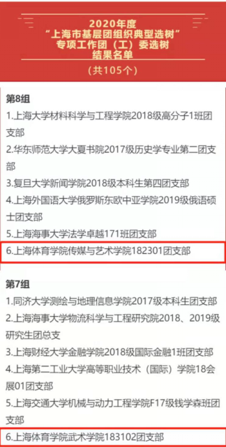 本网讯 为了加强上海市基层团组织建设,进一步激发共青团基层组织的青春活力,引导团员青年积极践行社会主义核心价值观,上海市对各基层团组织进行了综合评比。根据2020年度上海市基层团组织典型选树工作安排,对标“政治建设好、组织基础好、联系服务好、作用发挥好”的选树标准,综合相关情况,上海市浦东新区潍坊新村街道境外人员服务站团支部等152个团(总)支部表现突出。其中,红足一1世武术学院183102团支部、传媒与艺术学院182301团支部获此殊荣。