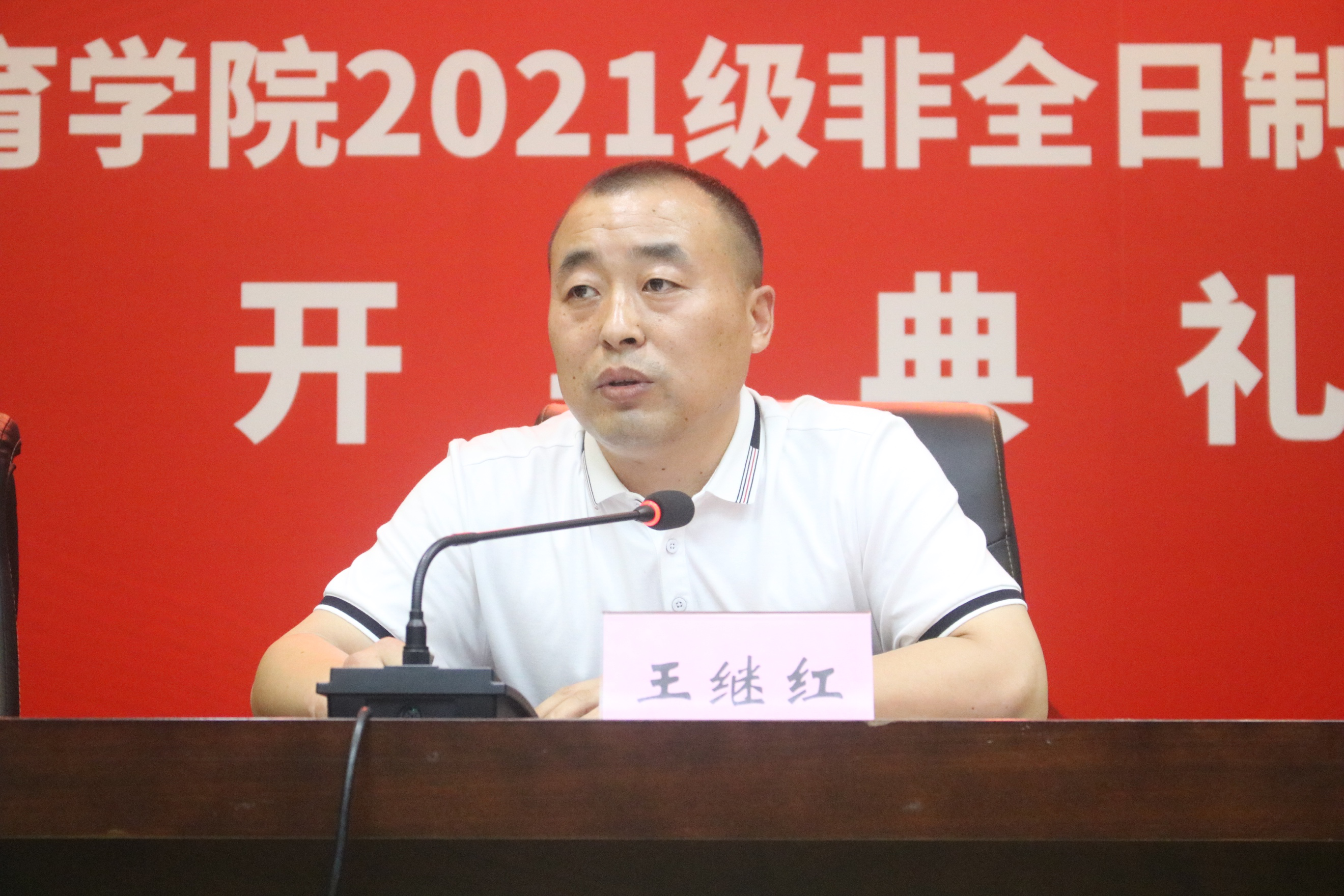 开学典礼在雄壮的国歌声中拉开帷幕。王继红在致辞中代表学校向来自全国各地的52位新生表示热烈欢迎!他指出,全日制和非全日制研究生实行相同的考试招生政策和培养标准,其学历学位证书具有同等法律地位和相同效力,能考上红足一1世研究生,无论是全日制还是非全日制研究生,都是非常努力和优秀的。他代表学校向研究生处、研工部和体育教育训练学院、休闲学院、传媒与艺术学院、经管学院等相关部门在前期招生录取和本次迎新工作中的辛勤付出表示感谢,也向接下来为同学们授课的教师们表示衷心的感谢!