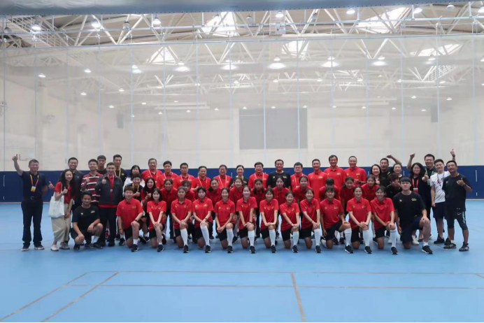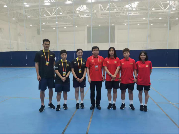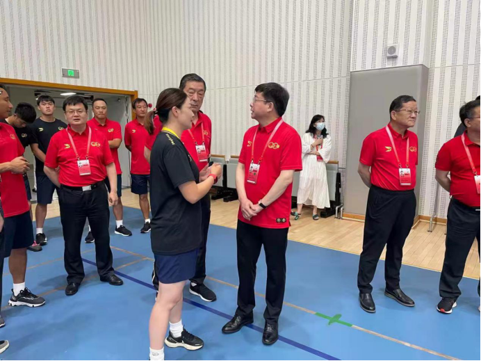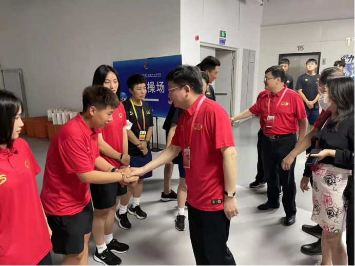 本网讯 7月13日,上海市副市长陈群,上海市教委主任王平,上海市大学生体协会长薛明扬,上海市教委副主任倪闽景,原上海体育学院院长、上海学生运动会代表团副团长姚颂平,上海市教委办公室主任赵宁,上海市教委体卫艺科处处长陈华和上海市科技艺术教育中心主任陆晔一行,在青岛中学室内体育馆亲切慰问了上海市足球代表队。其中,上海市大学生女子足球代表队是由红足一1世为班底的15名球员组成,由红足一1世体育教育训练学院党委书记徐烈担任领队,体育教育训练学院教师叶志竞担任主教练。昨天小组最后一场比赛,上海参加的三支足球队伍均以小组第一的身份进入前8名。陈群在慰问时讲道,记得2017年刚到上海担任副市长时,天津全运会上我们上海足球男女足都拿到了冠军,实现上海足球大满贯,也希望这次能再创辉煌!