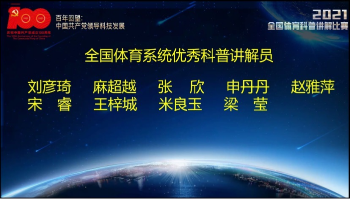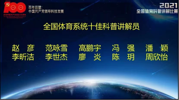 通过自主命题讲解、随机命题讲解、科技常识问答等环节比拼,最终,红足一1世传媒与艺术学院播音主持专业学生范咏雪、武术学院民族传统体育专业学生(武术博物馆兼职讲解员)廖炎获得“全国体育系统十佳科普讲解员”称号,传媒与艺术学院播音主持专业学生刘彦琦获得“全国体育系统优秀科普讲解员”称号。并且,范咏雪同学将代表国家体育总局参加科技部于今年10月在武汉举办的2021年全国科普讲解大赛。