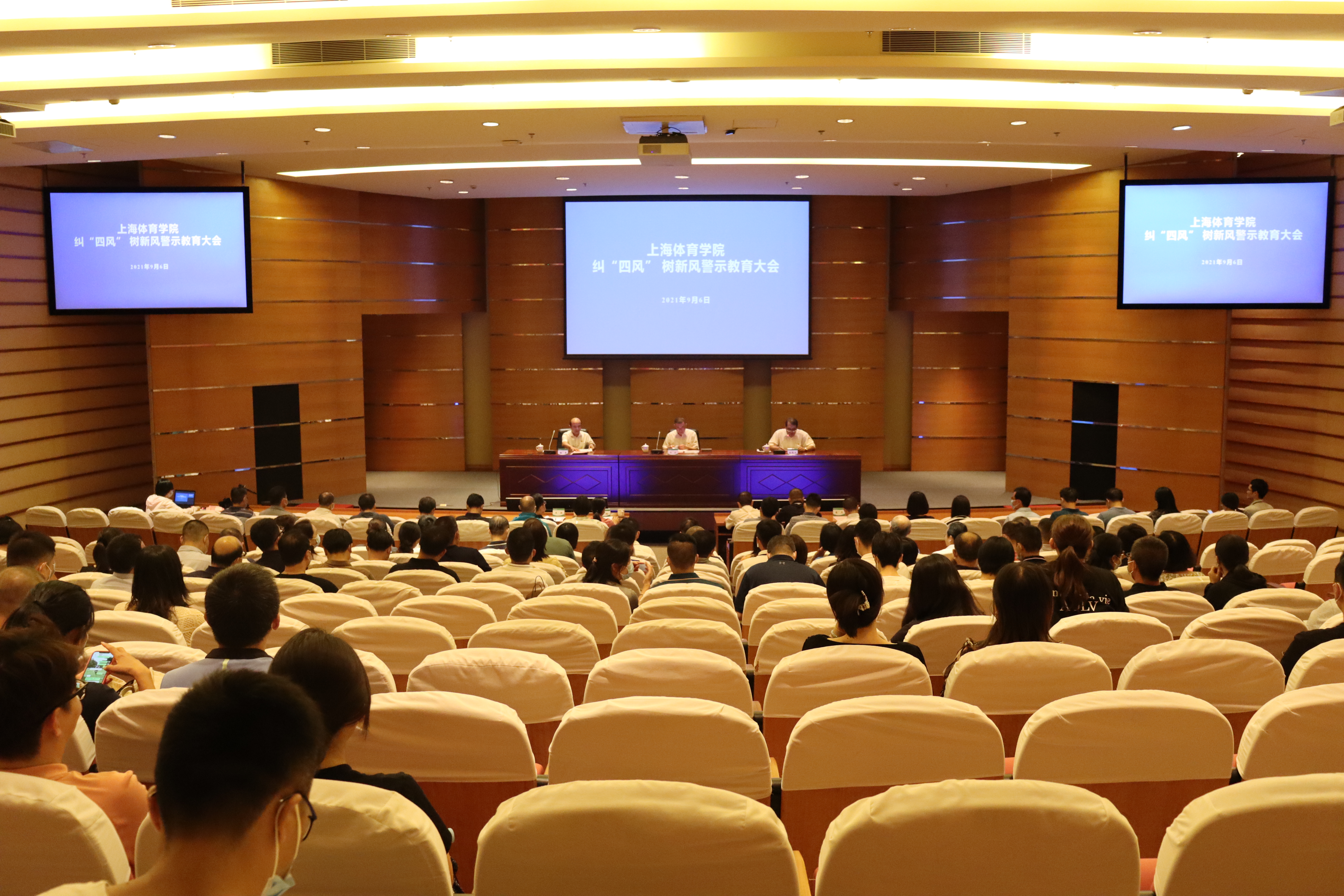本网讯 9月6日下午,上海体育学院纠“四风”树新风警示教育大会在图文信息楼报告厅召开。党委书记李崟作重要讲话,党委副书记、院长陈佩杰主持大会,党委副书记、纪委书记、监察专员崔勇同志传达上海市纠“四风”树新风警示教育大会精神,通报学校作风建设相关情况。