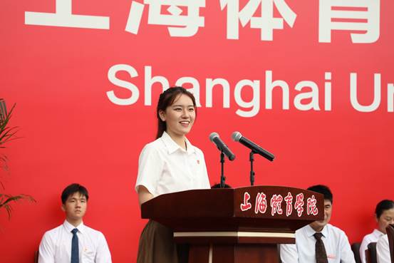 在校生代表、国家击剑队奥运科技服务项目团队成员、运动科学学院研究生施宇铭作为老生代表发言并领誓。他讲述了在东京奥运会重剑项目中的科研工作经历,亲身体会到上体人用实际行动诠释“身心一统,兼蓄竞攀”的校训,而自己也一路收获着成长和感动。