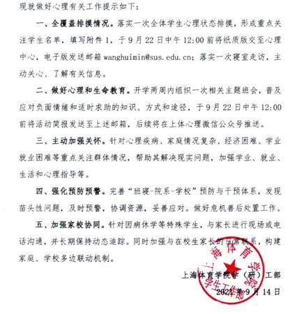 开学两周内,在学(研)工部心理健康教育与咨询中心指导下,由各学院负责实施,深入学生群体,落实一次寝室走访,开展心理健康状况大调研。主动加强对重点关注群体如家庭情况复杂、经济困难、学业就业困难、心理疾病学生的的关怀指导工作。