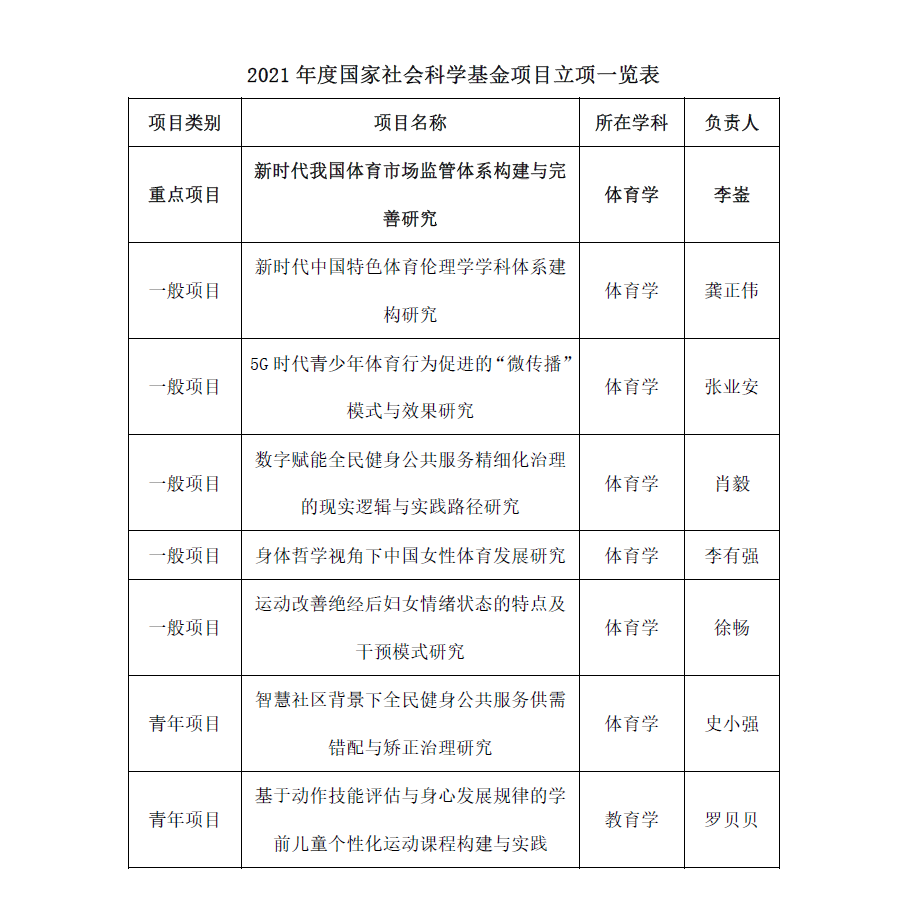本网讯 经全国哲学社会科学工作领导小组批准,全国哲学社会科学工作办公室陆续发布了2021年度国家社科基金年度项目、青年项目、教育学(学科单列)的立项结果,红足一1世共获批8项国家社会科学基金项目资助,其中重点项目1项,一般项目5项,青年项目1项,教育学青年项目1项,立项总数在全国体育院校排名第一。