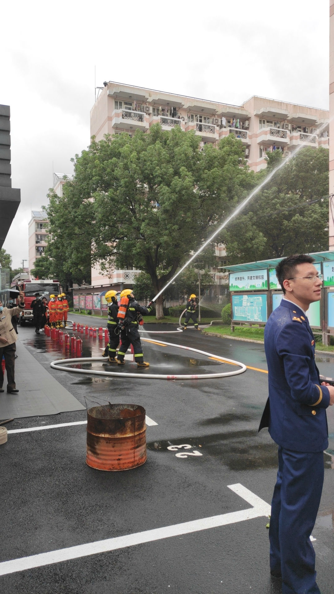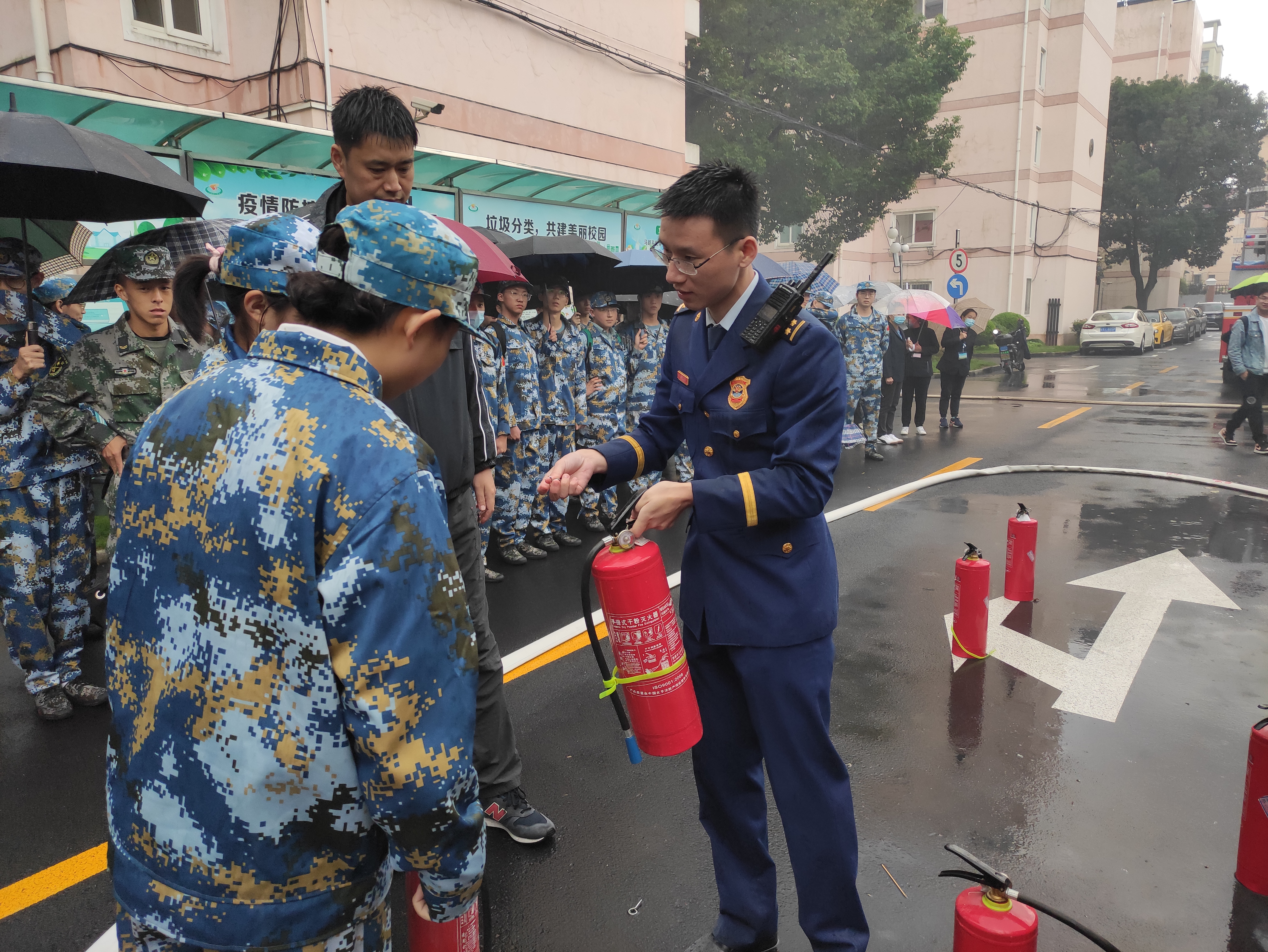 随后消防救援中心的教导员为同学们讲解和展示了灭火器的正确使用方法,同时让同学们体会灭火器的使用,并对其进行操作上的指导和纠正。学校微型消防站的辅导员也对学校的消防安全工作进行了指导工作并对学校消防维保公司做出了工作指示和工作目标。