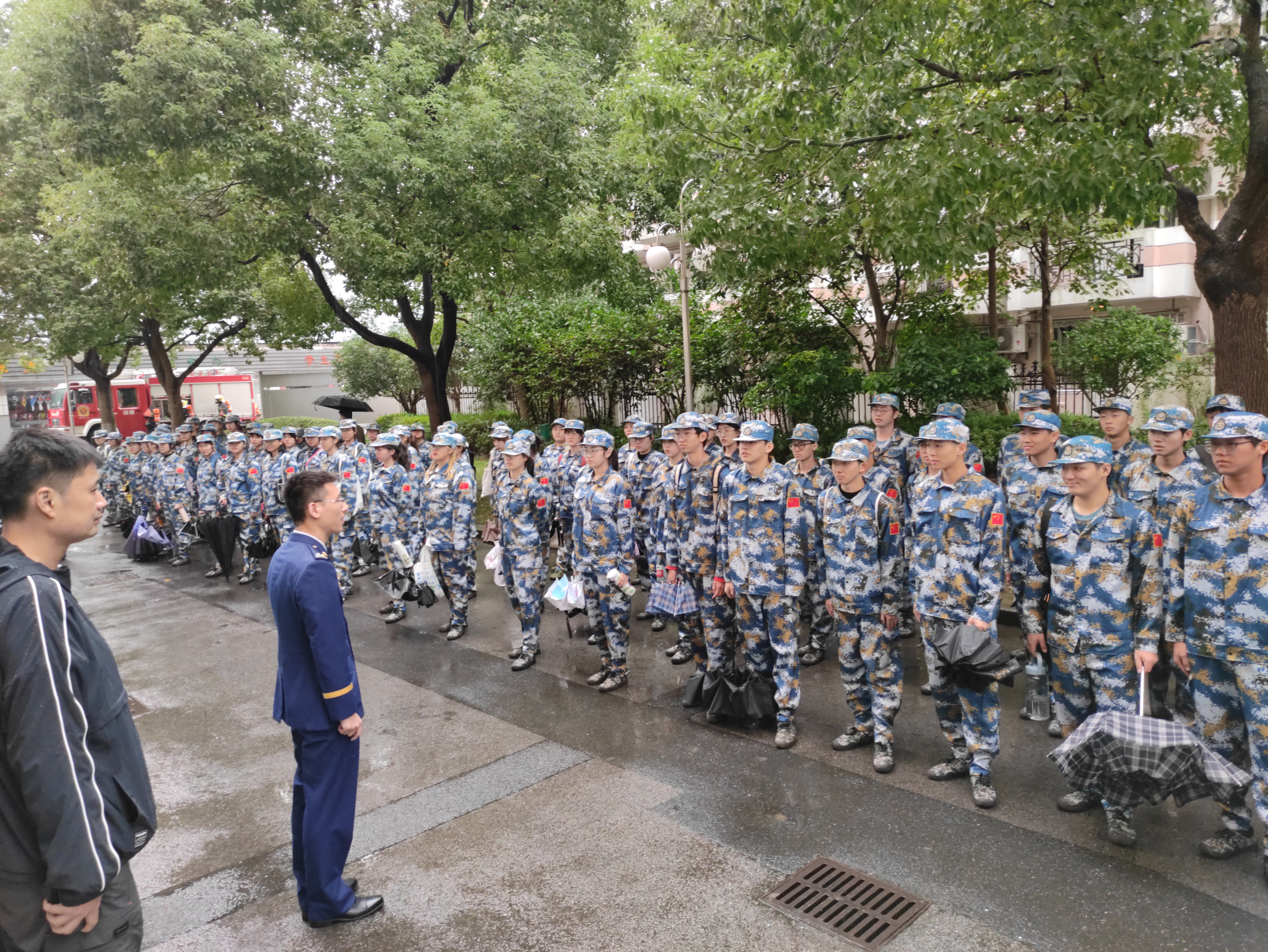 在宣讲之后,在杨浦区消防救援中心翔殷支队的配合下,军训学生进行了宿舍楼火灾逃生模拟演练和宿舍高层救援模拟演练。在宿舍楼火灾逃生模拟演练中,同学们严肃对待,弯腰捂鼻快速通过逃生通道来到安全区域。而宿舍高层救援模拟演练则更具有真实感,平台上放有无害烟饼模拟火灾现场浓烟滚滚的情形,在消防人员的专业操作下云梯升起,救援人员进入云梯救援区域并到达逃生平台成功“营救”两位“被困人员”,让人直呼精彩,也体现了消防救援人员的专业性和敬业精神。