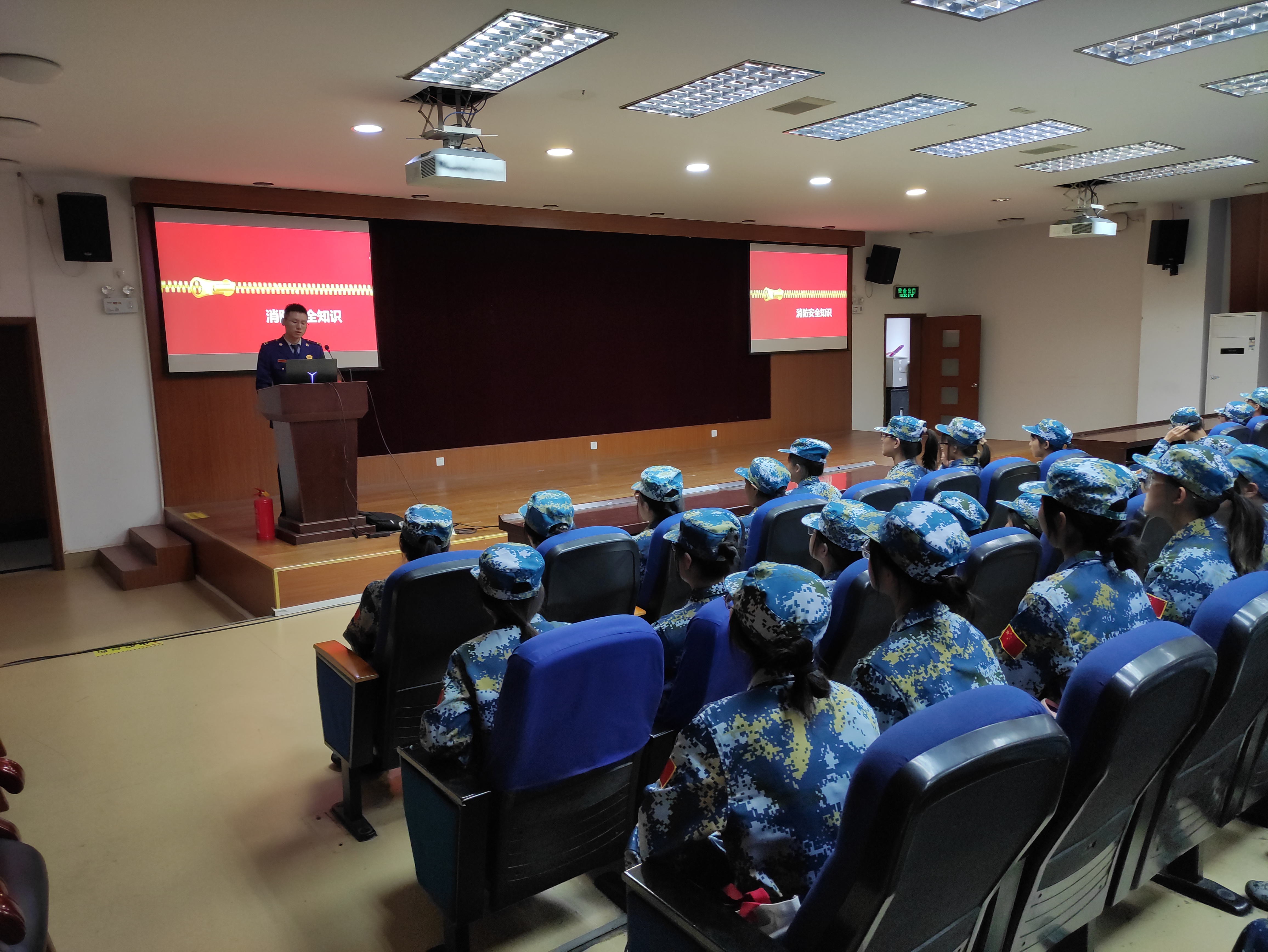 在演练前,杨浦区消防救援中心翔殷支队教导员在学生中心二楼报告厅为科技园员工、宿舍安全管理员和军训学生进行了相关消防安全知识、灭火器材知识、火灾前期灭火和火灾后期逃生知识的消防安全宣讲。宣讲内容丰富,生动有趣,有图文结合的硬核消防知识让人学习,也有一个个火灾事故现场的视频给人留下了深刻印象,让我们体会到火灾的严重后果,从而让我们更加重视火灾防范和消防安全知识的普及。