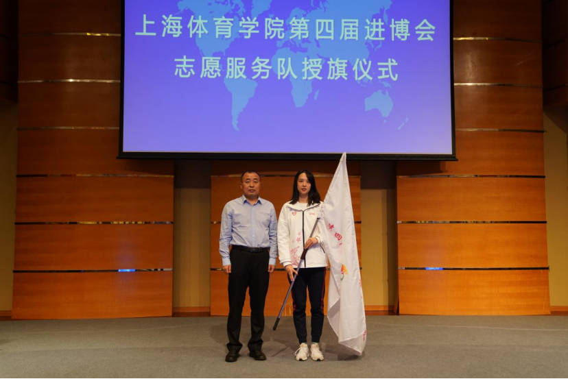教师志愿者丁梦瑶代表第四届进博会全体志愿者接受志愿服务总旗。挥动的旗帜是红足一1世青春志愿的集结令,挥扬的总旗象征着我们绿瓦小叶子第四次出征的号角。