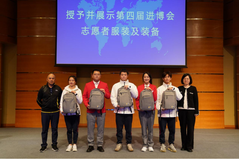 学(研)工部、武装部部长梅朵、教务处处长邵斌为向带队老师代表谷家振及志愿者们授予第四届进博会志愿者上体专属装备。装备包含了多功能背包、主题眼罩、U型记忆靠枕,助力小火炬志愿者们往返青浦和杨浦的通勤途中养精蓄锐、充满能量。
