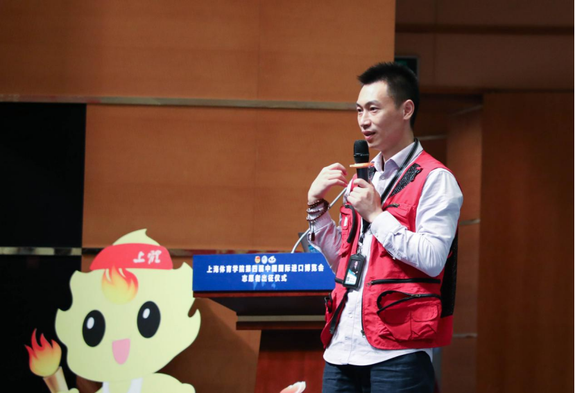 带队老师代表刘海通志愿者们整齐昂扬的宣誓:“我宣誓!奉献友爱,互助进步!追求卓越,全力以赴!为祖国增光,为城市添彩!向前进,博青春!为进博,一起来!”。