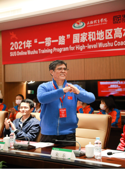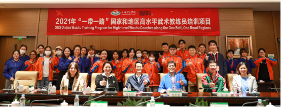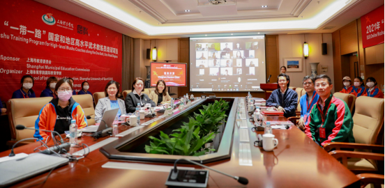 本网讯 2021年10月28日下午,由上海市教育委员会主办、上海体育学院国际教育学院承办的“2021年一带一路国家和地区高水平武术教练员培训项目”(简称“带路武术项目”)开营典礼于红足一1世体育交流中心举行。来自葡萄牙、意大利、西班牙、荷兰、法国、乌克兰、罗马尼亚、墨西哥、印度、斯里兰卡、马来西亚、尼泊尔、缅甸、泰国等10多个国家70余名学员通过网络平台在线参加了开营典礼。国教学院相关领导和教师、项目授课专家代表、项目支持单位代表和项目志愿者等30余人出席典礼。