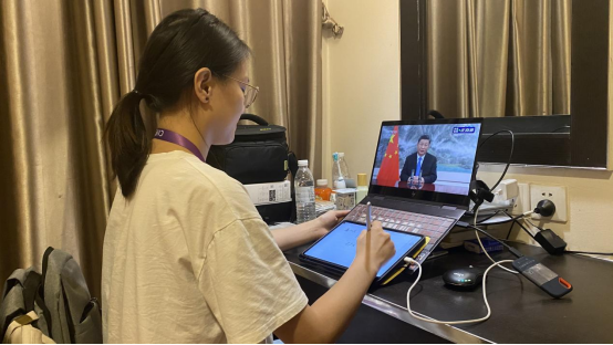 来自经管学院的王韵涵担任驻地保障组的工作,她在返程途中聆听习主席讲话,在疫情防控常态化背景下,作为一名小叶子,切身体会到今天进博会的成功举办来之不易,也为祖国的繁荣发展深感自豪。作为新时代的青年人,她从本次志愿活动学到良多,收货颇丰。在未来的日子里,自己也会更加努力,让青春在为祖国,为民族,为人民的不懈奋斗中绽放绚丽之花。