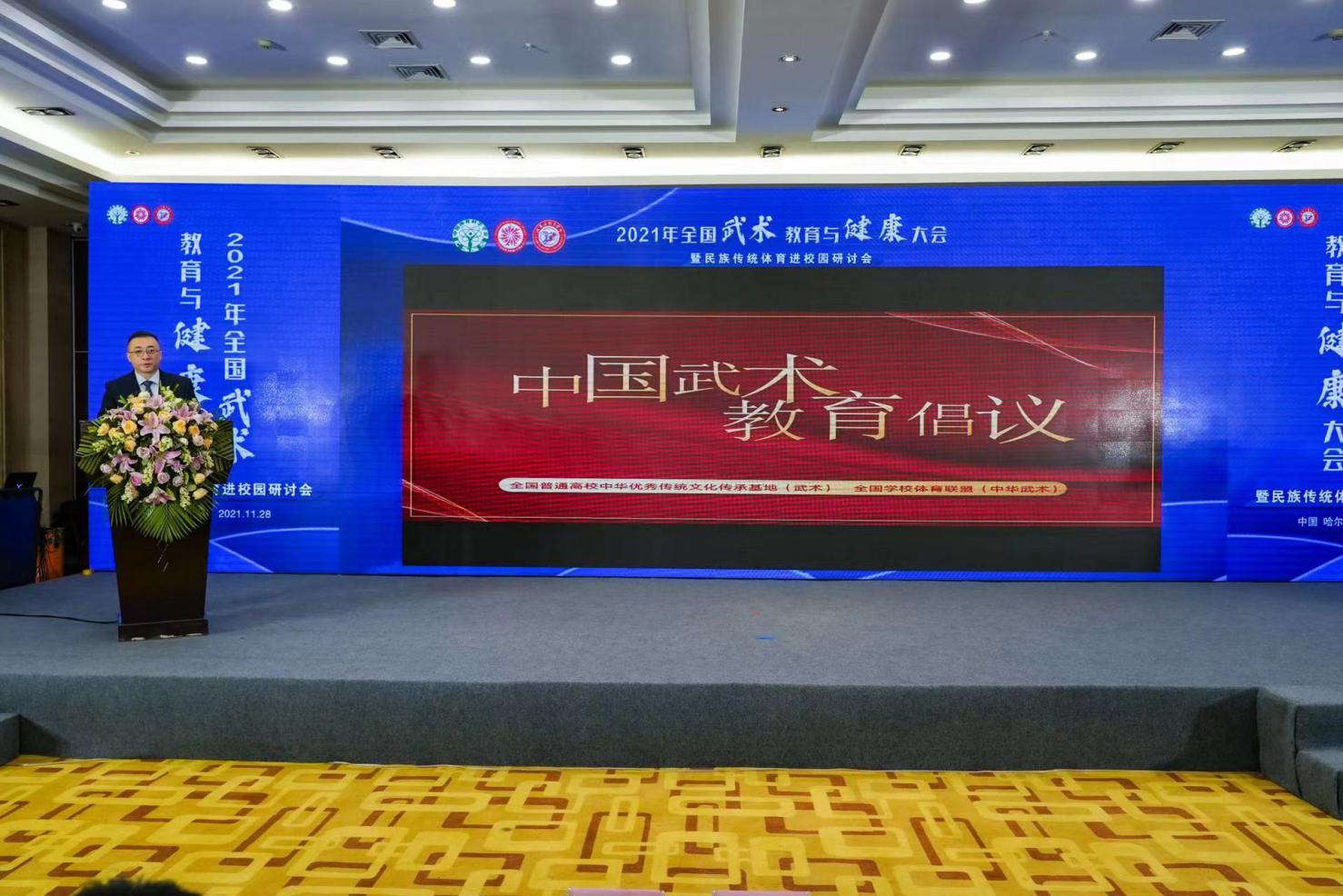大会开幕式上,上海体育学院党委书记李崟代表全国普通高校中华优秀传统文化传承基地(武术)、全国学校体育联盟(中华武术),发布了《中国武术教育倡议》。倡议指出,立足百年新起点,中国武术教育以“立德、增智、强体、育美、尚劳”为统领,致力不断树立武术德育新标杆、探索武术智育新方案、打造武术体育新样态、提升武术美育新境界、开辟武术劳育新路径。《倡议》的发布旨在更好发挥中国武术对德智体美劳全面培养教育体系的支撑价值,为培养德智体美劳全面发展的社会主义建设者和接班人贡献武术力量。中国体育科学学会副理事长祝莉从立足立德树人、课程思政、教育模式三个维度,以厚植爱国主义情怀、打造全方位健康教育范畴为重点,对中国武术教育发展提出殷切希望。