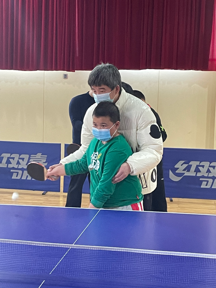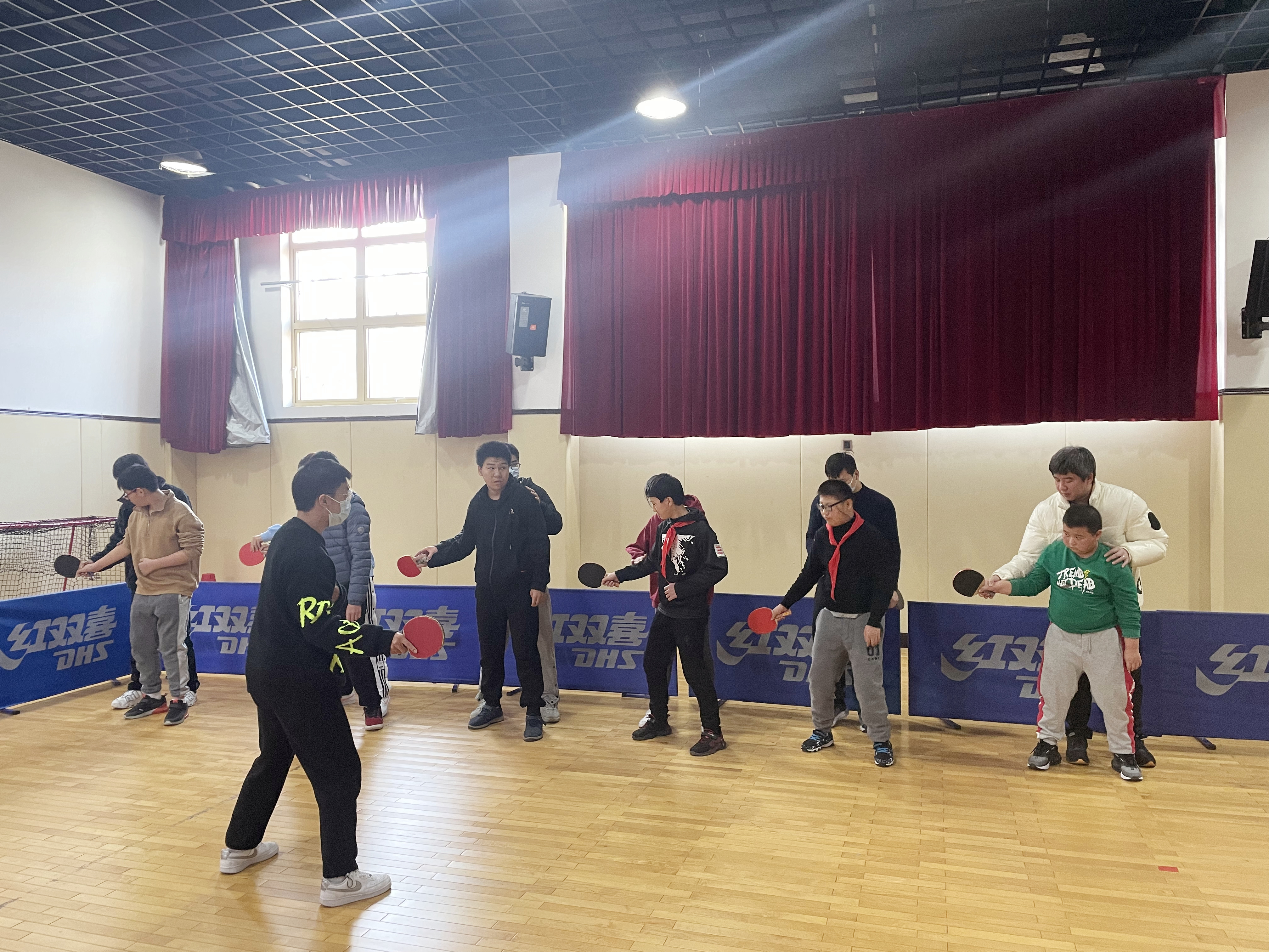 上海市杨浦区扬帆学校建于1987年,原为杨浦区辅读学校,是一所以接收智障少年儿童为主要教育对象的九年一贯制辅读学校。志愿服务中,晋鹏飞同学带领扬帆学校的学生们进行了准备活动,中乒院少年班男队主教练杜朋为学生们进行了一对一的动作指导。学生们聚精会神地盯着每一个球,从一招一式的模仿中逐步体会到了乒乓球运动的正确姿势。